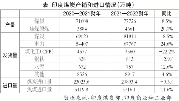 根據(jù)印度煤炭部的數(shù)據(jù),2021—2022財(cái)年,印度煤炭產(chǎn)量和發(fā)貨量分別為7.77億噸、8.18億噸,分別比上一財(cái)年增加了6100萬(wàn)噸、1.27億噸。電力行業(yè)為印度最大的煤炭需求方,2021—2022財(cái)年,印度對(duì)電力行業(yè)的煤炭發(fā)貨量為6.78億噸,占該國(guó)煤炭發(fā)貨總量的82.8%;其次為煤化工行業(yè),占比為4.3%;對(duì)鋼鐵行業(yè)的煤炭發(fā)貨量為813萬(wàn)噸,占比約1%(見下表)。
