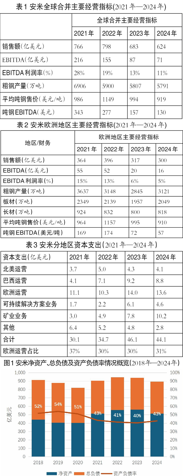 安米的全球經營指標反映出其集團層面的運營表現。過去4年,全球鋼鐵市場的產能過剩問題對安米造成了顯著影響,導致其整體利潤率大幅下降。2024年,安米的整體利潤率僅為2021年的1/3,同時噸鋼售價下降了7%,噸鋼利潤暴跌62%。