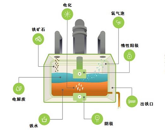 熔融鐵礦石電解煉鐵技術中的電解工藝圖例。  (圖片來源于波士頓金屬公司官網)