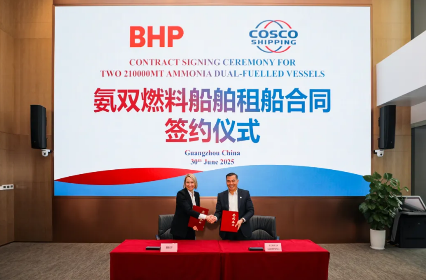 中遠(yuǎn)海運(yùn)集團(tuán)副總裁林戟表示:“中遠(yuǎn)海運(yùn)與必和必拓的合作可以追溯多年。作為全球礦產(chǎn)資源與航運(yùn)領(lǐng)域的杰出代表,雙方始終秉持著‘互利共贏’的理念,攜手面對(duì)行業(yè)挑戰(zhàn),共同推動(dòng)供應(yīng)鏈效率提升與凈零排放轉(zhuǎn)型。今天我們簽署的這兩艘21萬噸氨燃料雙燃料散貨船合同,不僅是雙方合作與時(shí)俱進(jìn)、攜手推動(dòng)替代船用燃料的重要成果,更是‘澳大利亞-中國綠色航運(yùn)走廊’建設(shè)的又一標(biāo)志性實(shí)踐。氨是最具潛力的零碳船用燃料之一,此次船型的落地,是全球散貨航運(yùn)領(lǐng)域向零碳邁進(jìn)的重要里程碑。它不僅代表著技術(shù)和環(huán)保的雙重突破,也彰顯了我們對(duì)堅(jiān)定支持全球氣候行動(dòng)、實(shí)現(xiàn)中國雙碳目標(biāo)的擔(dān)當(dāng)與信心。”