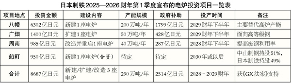 日本制鐵宣布到2029年將投資8687億日元(58.68億美元),在日本八幡、廣畑、周南等地新建或改造電爐,使電爐產能占比從28%提升至33%,以實現2030年減碳30%的目標。這一計劃已獲日本政府《GX法案》(綠色轉型法案)支持,預計將獲得最高2514億日元(16.98億美元)的補貼。