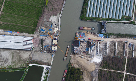 長(zhǎng)三角一體化示范區(qū)加速?gòu)?fù)工。3月24日拍攝的連接上海市金山區(qū)與浙江省嘉善縣的葉新公路-姚楊公路項(xiàng)目施工現(xiàn)場(chǎng)(無(wú)人機(jī)照片)。