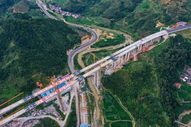 建設中的書洋特大橋(8月23日攝,無人機照片)。 8月24日,由中鐵十六局集團承建漳(州)武(平)高速公路重難點及控制性工程——書洋特大橋主橋順利合龍,該橋是全線首座合龍的大跨度橋梁。書洋特大橋采用雙向四車道高速公路標準,設計時速100公里,全長1074米,主墩高86米。 新華社發(許鵬健 攝)