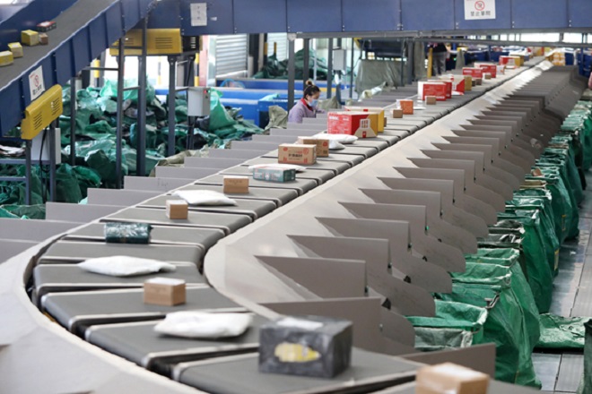 11月10日,在淮北市烈山區(qū)一家快遞企業(yè)分撥中心,工作人員在分揀車間忙碌。
