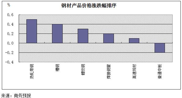 上周(12月17日至23日)鋼材價格環比上漲0.2%。其中熱軋帶鋼、槽鋼、螺紋鋼價格分別上漲0.5%、0.4%和0.3%。據有關機構統計,上周全國主要鋼材品種庫存總量799萬噸,環比下降1%,連續11周累計下降25.4%,預計后期鋼材價格將偏強震蕩。