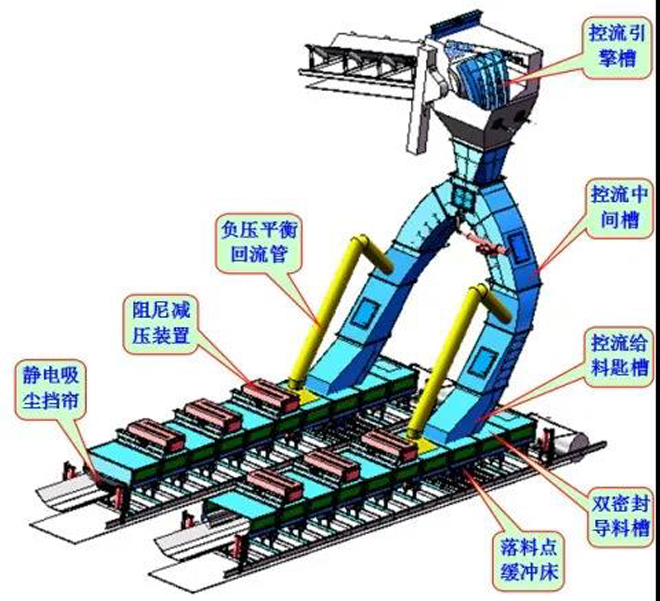 大幅度減少物料輸送破碎,提高成品率,更好的降低污染物外排,改善生產環境空氣質量。相對傳統普通導料槽單點受料技術除塵風量可降低~25%,多點受料的導料槽除塵點數量可減少約1/3,每點風量可降低~20%,由此,整個除塵系統風量配置至少可減少30%,除塵電機裝容量可減少40%~50%。與傳統工藝裝備相比,在投資和運行成本方面也具有很大的競爭優勢。隨著環保態勢日益嚴苛、超低排放和崗位粉塵濃度指標的要求提高,該技術和產品具有非常大的經濟效益和社會效益。