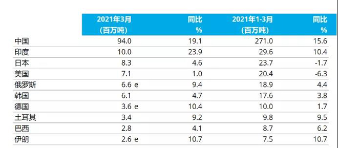 其中,中國粗鋼產量為9400萬噸,同比提高19.1%;印度粗鋼產量為1000萬噸,同比提高23.9%;日本粗鋼產量為830萬噸,同比提高4.6%;美國粗鋼產量為710萬噸,同比提高1.0%;俄羅斯粗鋼預估產量為660萬噸,同比提高9.4%;韓國粗鋼產量為610萬噸,同比提高4.7%;德國粗鋼預估產量為360萬噸,同比提高10.4%;土耳其粗鋼產量為340萬噸,同比提高9.2%;巴西粗鋼產量為280萬噸,同比提高