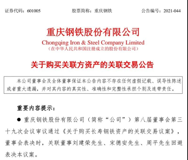 重慶鋼鐵6月11日公告,公司董事會及監事會審議通過《關于購買長壽鋼鐵資產的關聯交易議案》,同意公司購買長壽鋼鐵的鐵前資產。