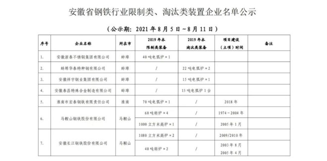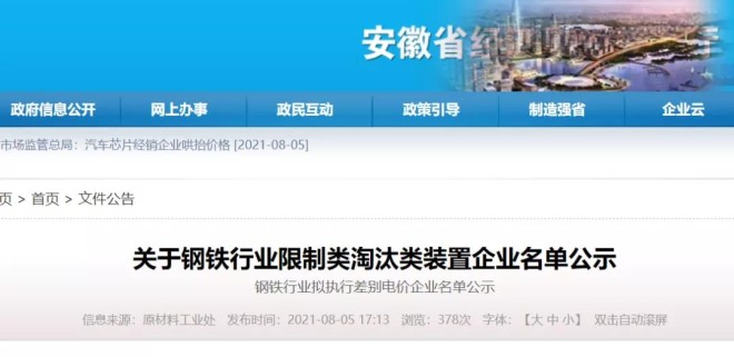 8月5日,安徽省經濟和信息化廳網站發布公告稱,根據《國家發展改革委 工業和信息化部關于運用價格手段促進鋼鐵行業供給側結構性改革有關事項的通知》(發改價格〔2016〕2803號)要求,將《安徽省鋼鐵行業限制類、淘汰類裝置企業名單》公示,名單中的17家鋼企擬被執行差別電價。公示期為8月5日—8月11日。