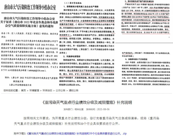 8月6日,唐山市印發(fā)《唐山市2022年北京冬奧會和冬殘奧會空氣質量保障實施方案》征求意見稿;唐山市環(huán)保局發(fā)布了《重污染天氣重點行業(yè)績效分級及減排措施》補充說明。
