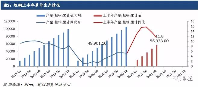 2020年我國粗鋼累計產量共計105299.9萬噸,2021年1-6月我國粗鋼產量共累計56333萬噸,按照粗鋼平控要求,下半年粗鋼產量則不得超過48966.9萬噸,即下半年較2020年減少需超6431.5萬噸,同比不得超過-11.61%。