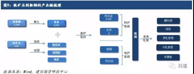 粗鋼的生產主要有長流程和短流程兩條路徑,長流程高爐煉鋼中生產一噸粗鋼平均需要用到1噸生鐵與0.15噸廢鋼,短流程電爐煉鋼中,根據鐵水熱裝比的不同需用到不同比例的廢鋼和鐵水。廢鋼作為短流程煉鋼的主要原材料在一定程度上與長流程主要原材料鐵礦石呈一定替代關系。