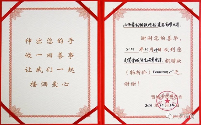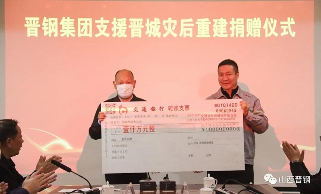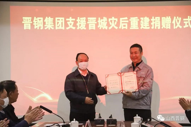 10月初,山西省出現了歷史以來最強秋汛,晉城部分地區連日遭受暴雨侵襲,給災區群眾的財產造成了嚴重損失。災情牽動人心,救援迫在眉睫。24日上午,晉鋼集團副總裁鄭品院將象征著公司大愛的“1000萬元支票”鄭重地交到晉城市副市長王宏微手中。這是晉鋼主動擔當作為的生動實例,更是集團多年來扎根晉城、發展晉城、服務晉城、奉獻晉城的生動寫照!