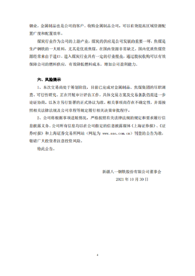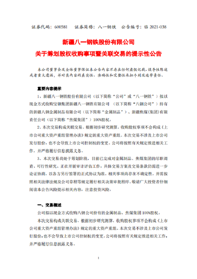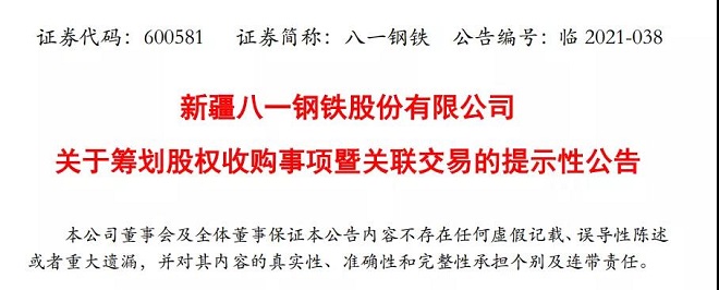 八一鋼鐵擬收購新疆八鋼金屬制品有限公司、新疆焦煤(集團)100%股權