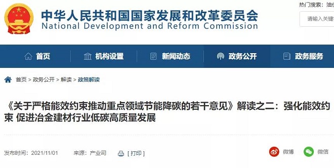 11月1日,國家發(fā)改委網(wǎng)站發(fā)表政策解讀文章,對(duì)《關(guān)于嚴(yán)格能效約束推動(dòng)重點(diǎn)領(lǐng)域節(jié)能降碳的若干意見》進(jìn)行解讀。文章指出:鋼鐵屬于產(chǎn)能嚴(yán)重過剩行業(yè),能效約束就是淘汰落后產(chǎn)能的重要方式之一。全文如下:
