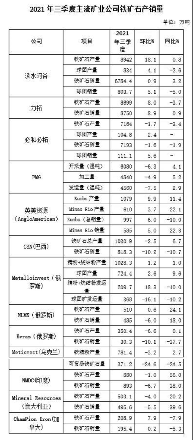 10月下旬以來,國際礦業公司陸續發布2021年三季度報告。現整理出部分主流礦山的鐵礦石產銷情況。