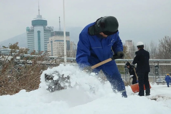朝陽鋼鐵職工奮力掃雪保產,消除設備故障隱患。