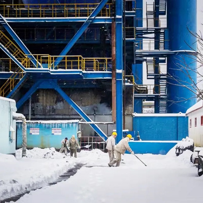 鞍山鋼鐵耐火材料公司夜班職工交班后,與白班同志一同清理廠區積雪,排查安全隱患,做好鞍山鋼鐵冶金石灰熔劑保產保供工作。