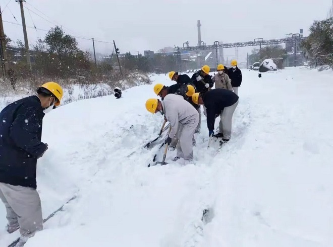 鞍鋼眾元產業綠源科技公司以雪為令,7日夜間要求作業區派專人入廠,連夜清掃渣道鐵路和道岔積雪。昨日一早又抽調人員協助清理積雪,保證渣罐運輸路線暢通。