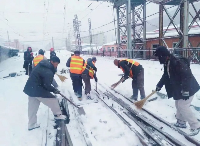 鞍鋼股份線材廠20多名干部職工參與清掃靈山站鐵路沿線積雪,在兩小時內清理出道岔近十個。