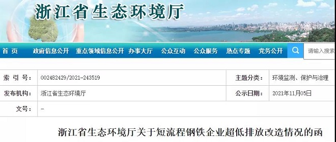 11月10日,浙江省生態環境廳官網發布了《浙江省生態環境廳關于短流程鋼鐵企業超低排放改造情況的函》。文件顯示,浙江省在產的短流程鋼鐵企業均已在實施超低排放改造,并開展超低排放評估監測。然而,截至2021年9月30日,浙江省在產的短流程鋼鐵企業在“有組織排放、無組織排放、清潔方式運輸”方面均未達到超低排放。