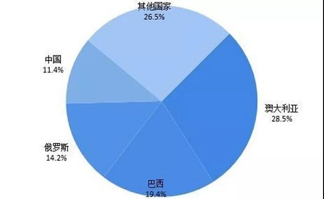 從國(guó)家來(lái)看,澳大利亞、俄羅斯、巴西、中國(guó)四個(gè)國(guó)家鐵礦石原礦儲(chǔ)量占比達(dá)到了73.5%,分布極不均衡,其中,澳大利亞鐵礦石儲(chǔ)量最為豐富,占全球比重達(dá)到28.5%,其次為巴西19.4%,俄羅斯14.2%,中國(guó)11.4%。