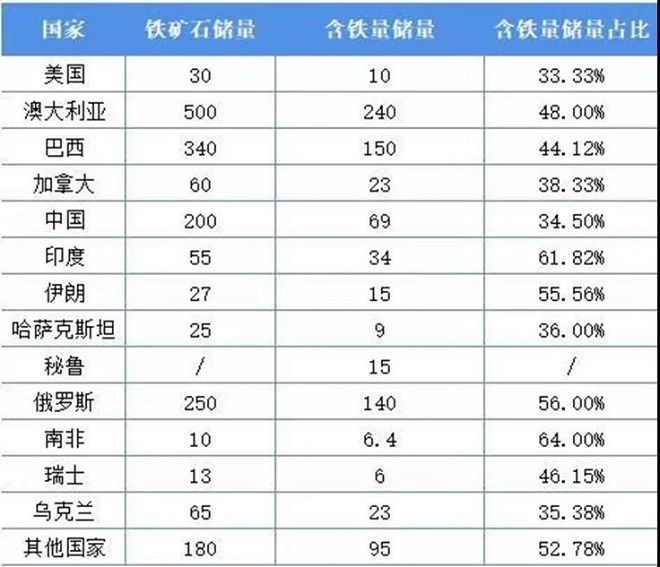 表:2020年全球鐵礦石儲(chǔ)量區(qū)域分布(單位:億噸,%)(來(lái)源:USGS)