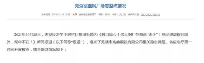 據(jù)安徽應(yīng)急管理廳網(wǎng)消息:2021年10月28日,央視經(jīng)濟(jì)半小時欄目播出標(biāo)題為《觸目驚心!偌大鋼廠存隱形“殺手”!總經(jīng)理卻移民國外,常年不在!》新聞報道(以下簡稱“報道”),曝光了蕪湖市富鑫鋼鐵有限公司相關(guān)隱患問題。省應(yīng)急廳第一時間開展核查,核查整改情況如下: