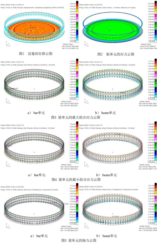中冶京誠根據多年建造經驗及數據積累,采用了大型有限元結構分析軟件MSC/NASTRAN、后處理軟件MSC/PATRAN進行整體分析,針對柜體和活塞在不同工作狀態下可能出現的受力狀態進行分析計算,并運用Midasgen程序進行柜體和活塞單體計算,徹底攻克了該類型氣柜運行受力計算模型,從根本上解決了活塞運行不穩定性的病根。