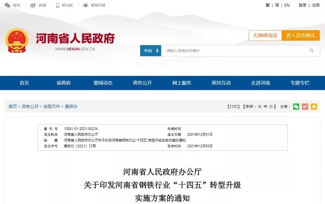 12月9日,河南省人民政府辦公廳發布了關于印發河南省鋼鐵行業“十四五”轉型升級實施方案的通知。