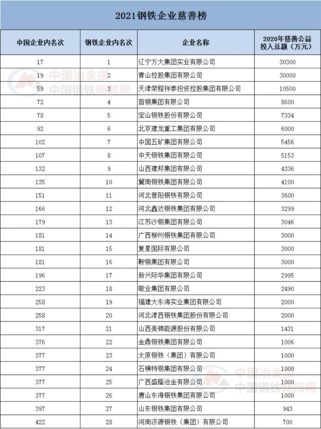 《2021鋼鐵企業慈善榜》名單如下: