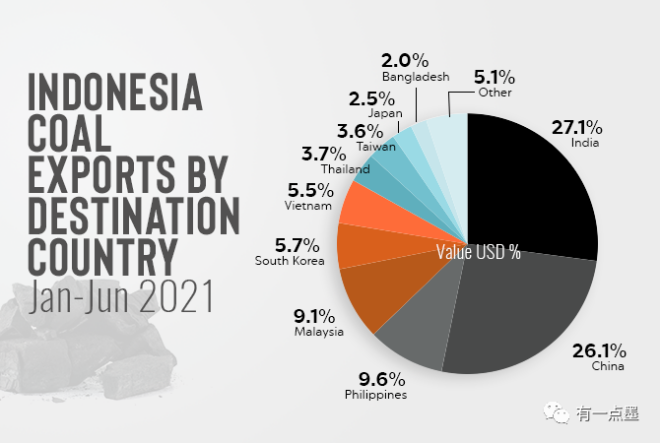 印尼煤炭的主要出口目的地國家是中國、印度、日本和韓國。在高峰時期,煤炭占國家采礦業總收入的85%左右。印尼面向中國和印度這兩個巨大的新興市場的戰略地理位置。由于建造了許多新的燃煤發電廠來為其龐大的人口供電,這兩個國家對劣質煤炭的需求猛增。