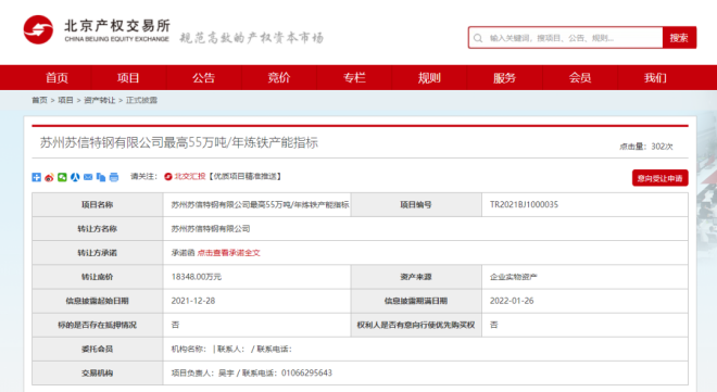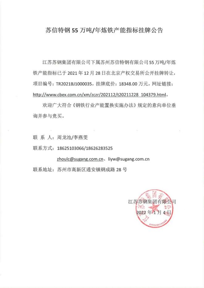 江蘇蘇鋼集團有限公司下屬蘇州蘇信特鋼有限公司55萬噸/年煉鐵產(chǎn)能指標(biāo)已于2021年12月28日在北京產(chǎn)權(quán)交易所公開掛牌轉(zhuǎn)讓,歡迎符合《鋼鐵行業(yè)產(chǎn)能置換實施辦法》規(guī)定的意向單位垂詢并參與競買。