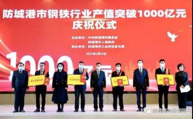2022年1月14日,防城港市委、市人民政府舉辦防城港市鋼鐵行業產值突破1000億元慶祝儀式,宣布2021年該市鋼鐵全行業產值實現1075.2億元,成為該市首個產值突破千億元的支柱產業。防城港市也由此成為全區第二個擁有單個千億級行業的地級市。