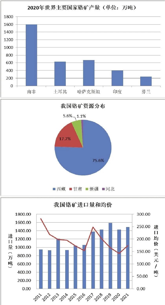 截至2020年末,世界鉻礦探明儲量約為5.7億噸。鉻礦資源豐富的國家主要有哈薩克斯坦、南非、印度、土耳其和芬蘭等,其中哈薩克斯坦、南非和印度3個國家的鉻礦資源量合計超過世界總量的90%。