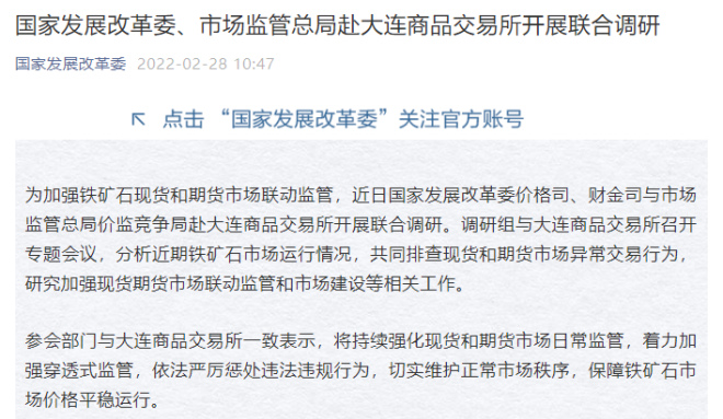 2月28日,國家發(fā)展改革委官微發(fā)布消息稱,為加強(qiáng)鐵礦石現(xiàn)貨和期貨市場聯(lián)動監(jiān)管,近日國家發(fā)展改革委價(jià)格司、財(cái)金司與市場監(jiān)管總局價(jià)監(jiān)競爭局赴大連商品交易所開展聯(lián)合調(diào)研。調(diào)研組與大連商品交易所召開專題會議,分析近期鐵礦石市場運(yùn)行情況,共同排查現(xiàn)貨和期貨市場異常交易行為,研究加強(qiáng)現(xiàn)貨期貨市場聯(lián)動監(jiān)管和市場建設(shè)等相關(guān)工作。