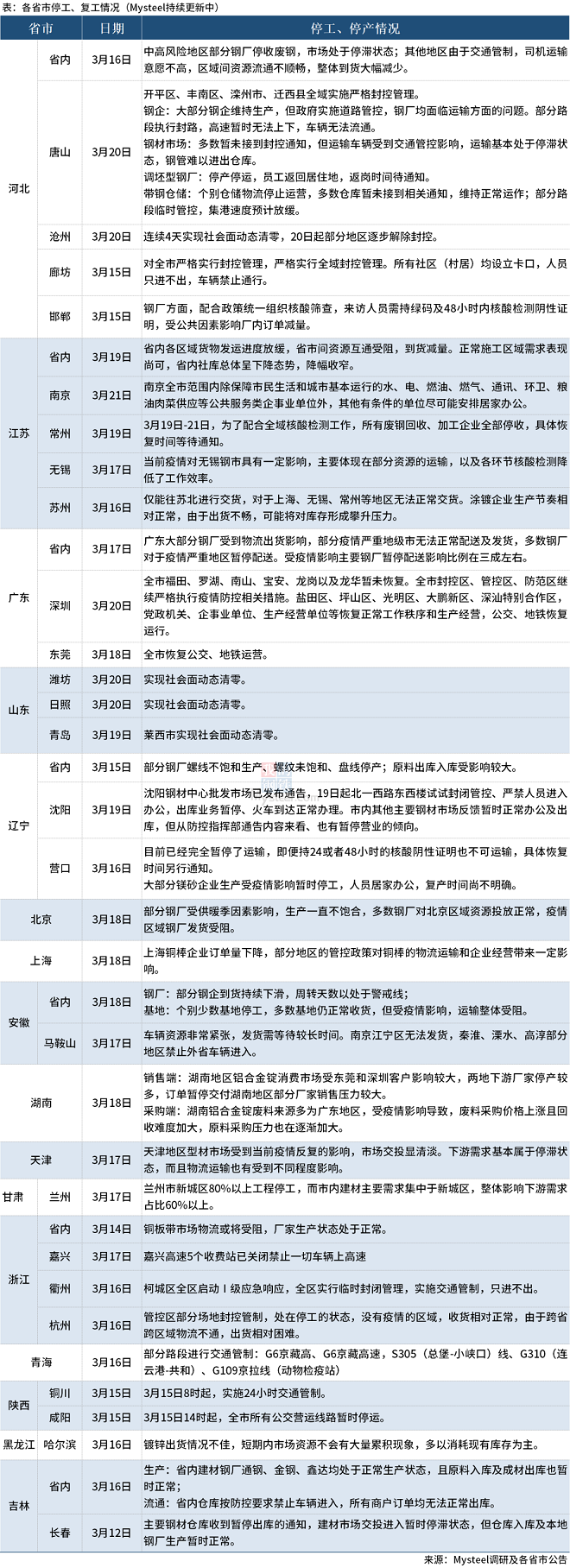 截至3月21日,16個省份停工復工情況見下表。其中,3月21日,南京全市范圍內除保障市民生活和城市基本運行的水、電、燃油、燃氣、通信、環衛、糧油肉菜供應等公共服務類企事業單位外,其他有條件的單位盡可能安排居家辦公。3 月20日,唐山開平區、豐南區、灤州市、遷西縣全域實施嚴格封控管理;大部分鋼企維持生產,但政府實施道路管控,鋼廠均面臨運輸方面的問題。深圳全市福田、羅湖、南山、寶安、龍崗以及龍華暫未恢復,全市封控區、管控區、防范區繼續嚴格執行疫情防控相關措施。山東濰坊、日照、青島萊西市實現社會面動態清零。河北滄州連續4天實現社會面動態清零,3月20日起部分地區逐步解除封控。