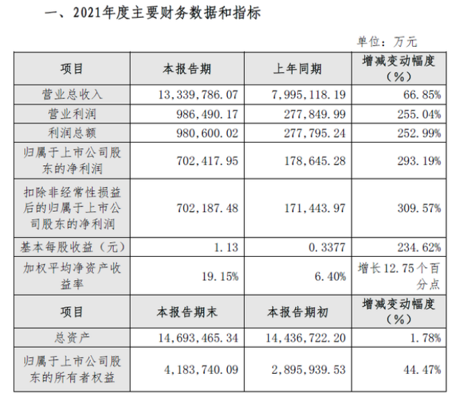 首鋼股份發(fā)布的業(yè)績(jī)快報(bào)顯示,2021年?duì)I業(yè)總收入1333.98億元,比上年同期增長(zhǎng)66.85%;歸屬于上市公司股東的凈利潤(rùn)70.24億元,同比增長(zhǎng)293.19%,這是首鋼股份自1999年A股上市以來的最好業(yè)績(jī)。