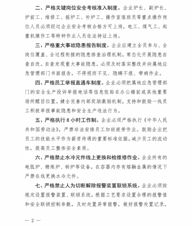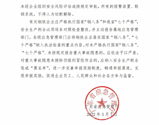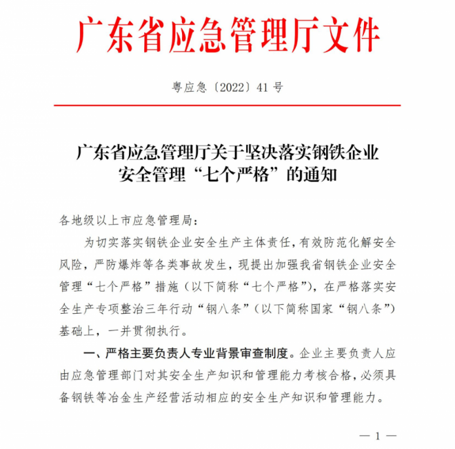 近日,廣東省應急管理廳下發了關于堅決落實鋼鐵企業安全管理“七個嚴格”的通知。通知提到,為切實落實鋼鐵企業安全生產主體責任,有效防范化解安全風險,嚴防爆炸等各類事故發生,現提出加強廣東省鋼鐵企業安全管理“七個嚴格”措施(以下簡稱“七個嚴格”),在嚴格落實安全生產專項整治三年行動“鋼八條”(以下簡稱國家“鋼八條”)基礎上,一并貫徹執行。