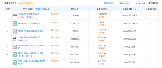 天眼查工商信息顯示,該合伙企業(yè)由中國(guó)寶武鋼鐵集團(tuán)有限公司出資29.99億元;建信金融資產(chǎn)投資有限公司出資11.24億元;國(guó)家綠色發(fā)展基金股份有限公司出資9.99億元;上海寶恒經(jīng)濟(jì)發(fā)展有限公司出資5億元;建信金投基金管理(天津)有限公司、綠色發(fā)展基金私募股權(quán)投資管理(上海)有限公司、華寶(上海)股權(quán)投資基金管理有限公司各出資100萬(wàn)元。