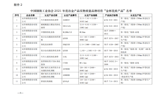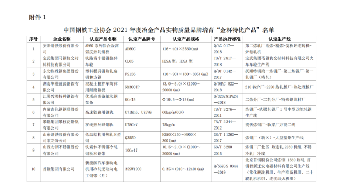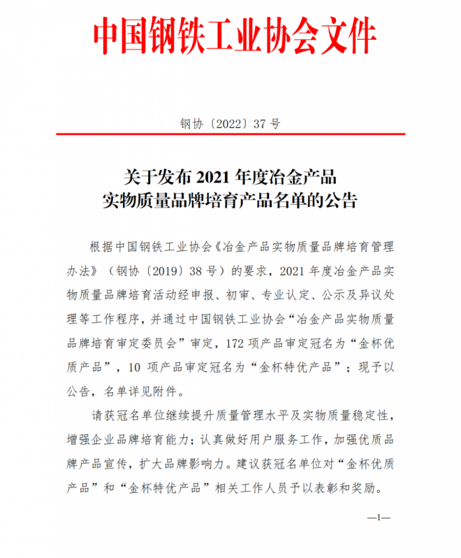 根據中國鋼鐵工業協會《冶金產品實物質量品牌培育管理 辦法》(鋼協〔2019〕38號)的要求,2021年度冶金產品實物質量品牌培育活動經申報、初審、專業認定、公示及異議處理等工作程序,并通過中國鋼鐵工業協會“冶金產品實物質量品牌培育審定委員會”審定,172項產品審定冠名為“金杯優質產品”,10項產品審定冠名為“金杯特優產品”。