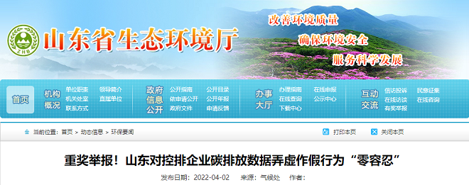 4月2日,山東省生態環境廳發布了《控排企業碳排放報告質量弄虛作假有獎舉報實施方案》(以下簡稱《方案》)。