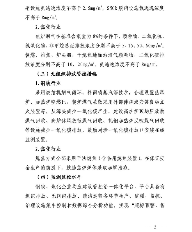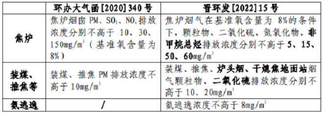 《通知》要求,焦?fàn)t煙氣在基準(zhǔn)含氧量為8%的條件下,顆粒物、二氧化硫、氮氧化物、非甲烷總烴排放濃度分別不高于5、15、50、60mg/m3。裝煤、推焦、爐頭煙、干熄焦地面站煙氣顆粒物、二氧化硫排放濃度分別不高于10、20mg/m3。氨逃逸濃度不高于8mg/m3。