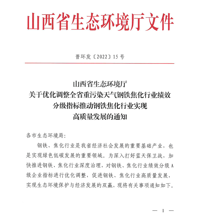 5月9日,山西省生態(tài)環(huán)境廳辦公室印發(fā)了《山西省生態(tài)環(huán)境廳關(guān)于優(yōu)化調(diào)整全省重污染天氣鋼鐵焦化行業(yè)績(jī)效分級(jí)指標(biāo)推動(dòng)鋼鐵焦化行業(yè)實(shí)現(xiàn)高質(zhì)量發(fā)展的通知》(晉環(huán)發(fā)[2022]15號(hào))(以下簡(jiǎn)稱《通知》)。