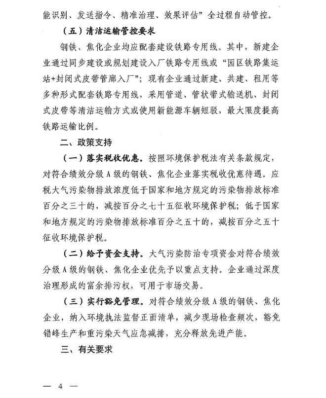 按照環(huán)境保護(hù)稅法有關(guān)條款規(guī)定,對(duì)符合績(jī)效分級(jí)A級(jí)的鋼鐵、焦化企業(yè)落實(shí)稅收優(yōu)惠待遇。應(yīng)稅大氣污染物排放濃度低于國(guó)家和地方規(guī)定的污染物排放標(biāo)準(zhǔn)百分之三十的,減按百分之七十五征收環(huán)境保護(hù)稅;低于國(guó)家和地方規(guī)定的污染物排放標(biāo)準(zhǔn)百分之五十的,減按百分之五十征收環(huán)境保護(hù)稅。