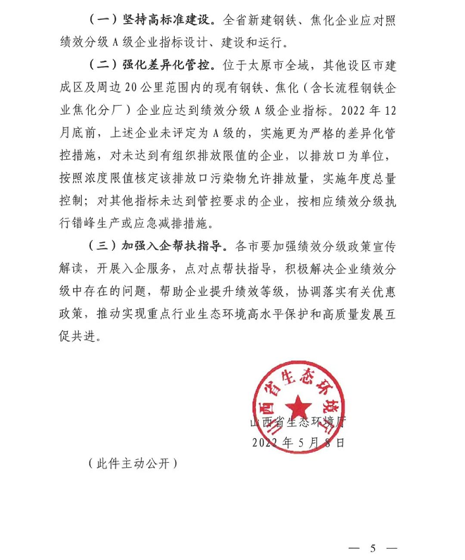位于太原市全域,其他設(shè)區(qū)市建成區(qū)及周邊20公里范圍內(nèi)的現(xiàn)有鋼鐵、焦化(含長(zhǎng)流程鋼鐵企業(yè)焦化分廠)企業(yè)應(yīng)達(dá)到績(jī)效分級(jí)A級(jí)企業(yè)指標(biāo)。2022年12 月底前,上述企業(yè)未評(píng)定為A級(jí)的,實(shí)施更為嚴(yán)格的差異化管控措施,對(duì)未達(dá)到有組織排放限值的企業(yè),以排放口為單位,按照濃度限值核定該排放口污染物允許排放量,實(shí)施年度總量控制;對(duì)其他指標(biāo)未達(dá)到管控要求的企業(yè),按相應(yīng)績(jī)效分級(jí)執(zhí)行錯(cuò)峰生產(chǎn)或應(yīng)急減排措施。