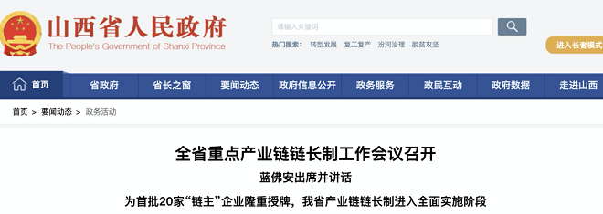 5月27日,從山西省人民政府網(wǎng)站獲悉,山西省政府召開(kāi)全省重點(diǎn)產(chǎn)業(yè)鏈鏈長(zhǎng)制工作會(huì)議,為首批20家“鏈主”企業(yè)隆重授牌,山西省產(chǎn)業(yè)鏈鏈長(zhǎng)制進(jìn)入全面實(shí)施階段。