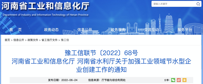 6月24日,河南省工業(yè)和信息化廳、河南省水利廳發(fā)布了《關于加強工業(yè)領域節(jié)水型企業(yè)創(chuàng)建工作的通知》(以下簡稱《通知》),推進重點用水工業(yè)領域節(jié)水型企業(yè)建設,促進企業(yè)對標達標,加快轉變工業(yè)用水方式,全面提升工業(yè)用水效率和節(jié)水技術水平。