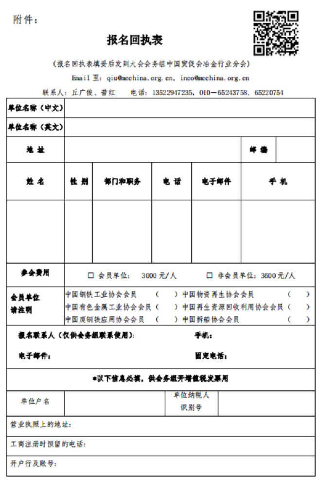 請參會代表于7月20日之前將報(bào)名回執(zhí)表(見附件)填妥后發(fā)到大會會務(wù)組中國貿(mào)促會冶金行業(yè)分會,或者掃描二維碼注冊報(bào)名。中方代表參會費(fèi)為: