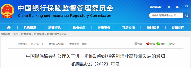 近日,中國銀行保險監督委員會網站發布了《中國銀保監會辦公廳關于進一步推動金融服務制造業高質量發展的通知》(以下簡稱“《通知》”)。